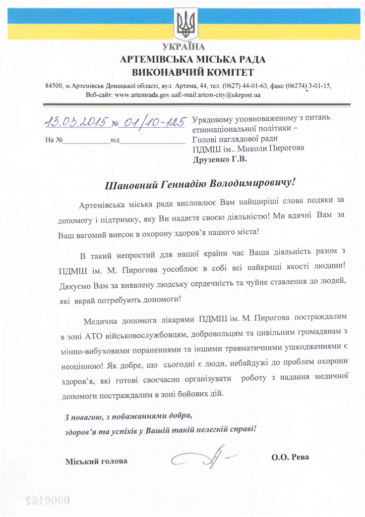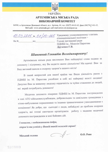 Artemivsk Mayor Oleksiy Reva sent a letter to the PFVMH Board of Trustees Chairman, Governmental Commissioner for Ethnonational Policy Gennadiy Druzenko, thanking for his assistance and ponderable contribution to healthcare in this Donetsk Oblast city.