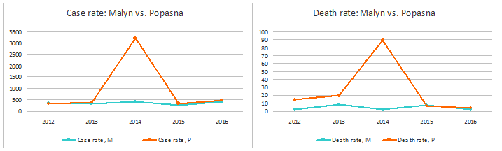 On the right chart, the diabetes death rate in Popasna District before the war was somewhat higher, but after its surge of 2014 not just "fell into place" but, in a good sense, "caught up" with that in Malyn District.