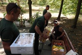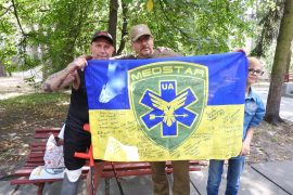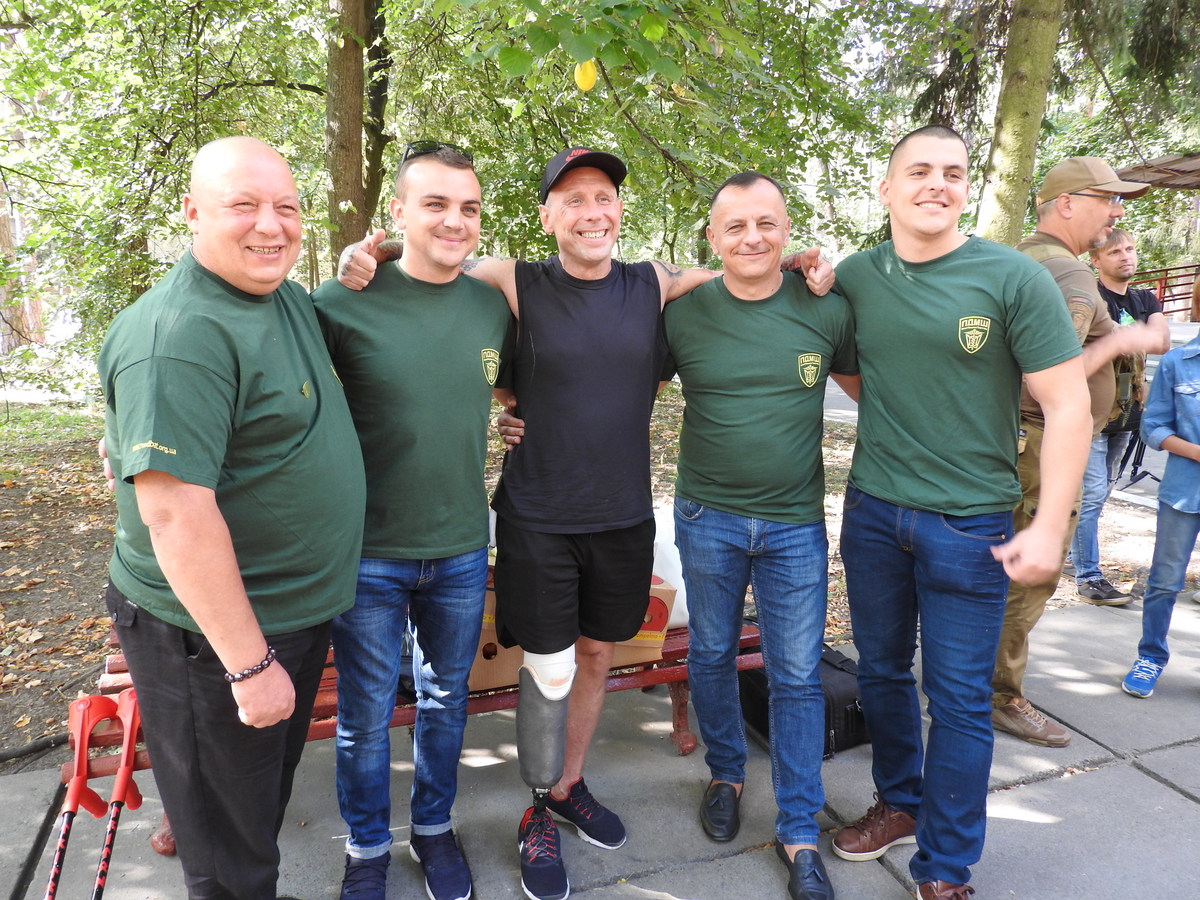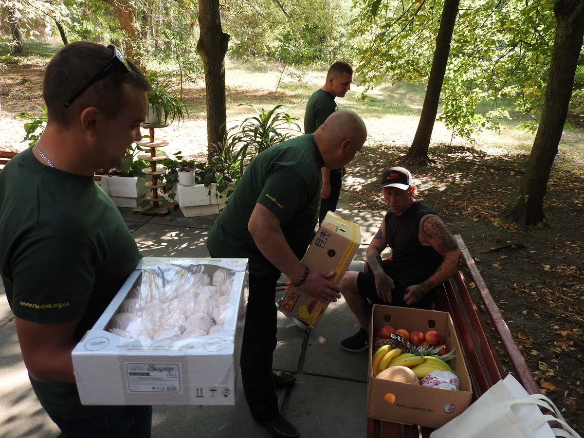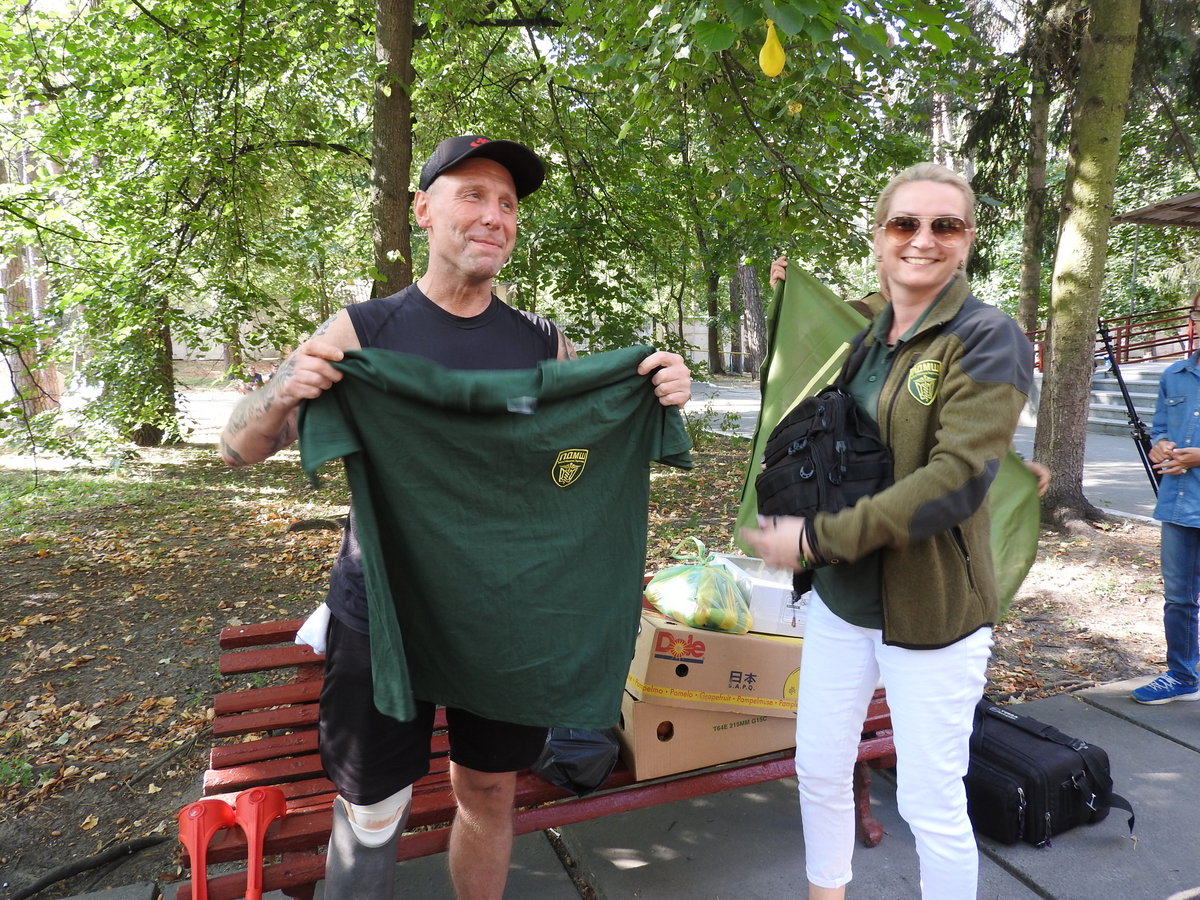 As is customary, the guests from Vinnytsya did not come to see their blood brother empty-handed but brought fruit and goodies as well as moonshine in a souvenir bottle with “Tryton” inscription. Dmytro Herzhan was also given as presents inscribed flags of the PFVMH and MedStar Medevac and a PFVMH-branded T-shirt.