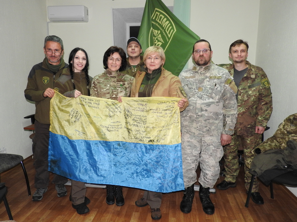 В офісі ПДМШ перед дорогою. На передньому плані – прапор з Майдану, який супроводжує Вікторію Крамаренко в усіх її поїздках. Зліва направо: президент ПДМШ Геннадій Друзенко, Олена Мосійчук, Ірина Коцюбинська, Ігор Буйвол, Вікторія Крамаренко, Максим Козачина та Олексій Голубенко[/caption]