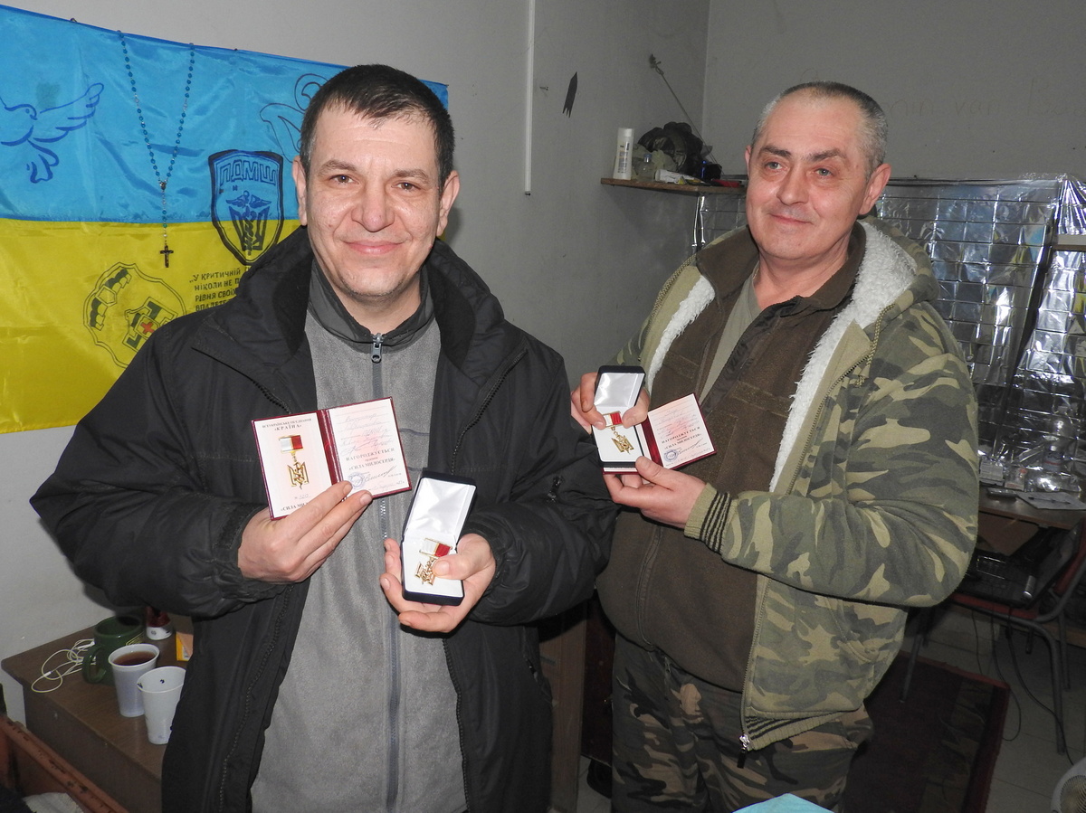 Мар'їнка, 12 березня 2019. Ігор Писарчук (справа) і його побратим по ПДМШ Володимир Гаврищенко отримали відзнаки з нагоди Дня українського добровольця[/caption]