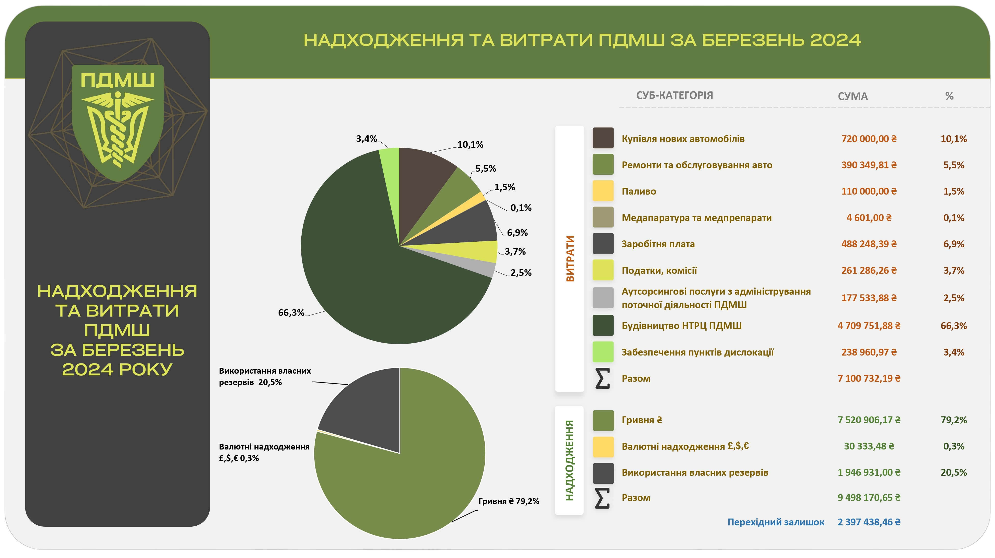 Отже, у березні 2024 року ПДМШ мав у своєму розпорядженні майже 9,5 млн грн. Ця сума включає понад 7,5 млн грн в українській національній валюті та еквівалент більш як 30,3 тис. грн в іноземній, а також понад 1,9 млн власних резервів.