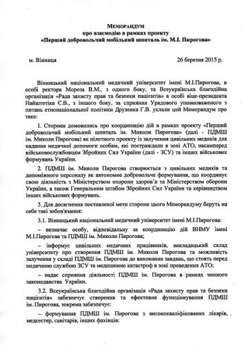 У Вінницькому національному медичному університеті імені М. І. Пирогова відбулася церемонія підписання Меморандуму про взаємодію між університетом і Всеукраїнською радою захисту прав та безпеки пацієнтів у рамках проекту «Перший добровольчий мобільний шпиталь ім. Миколи Пирогова».