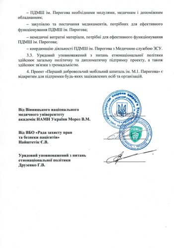 Меморандум підписали ректор ВНМУ Василь Мороз і віце-президент Ради захисту прав та безпеки пацієнтів Євген Найштетік. Документ також скріпив своїм підписом Урядовий уповноважений з питань етнонаціональної політики — Голова Наглядової ради ПДМШ Геннадій Друзенко.