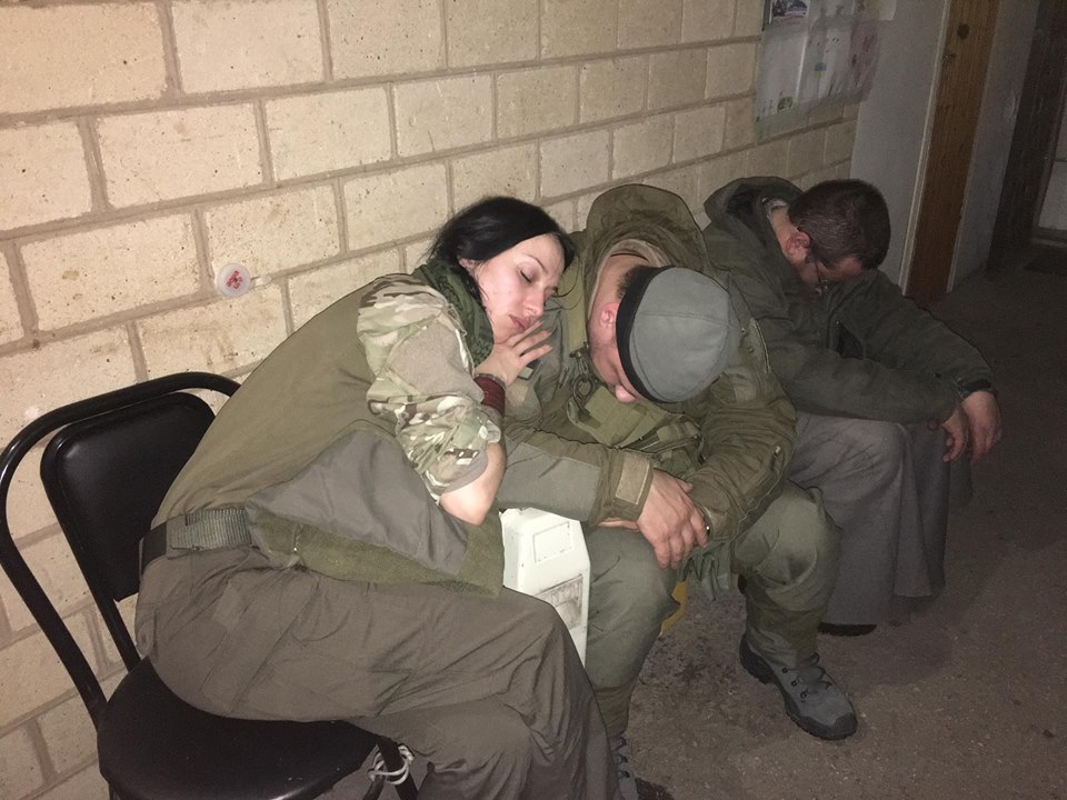 В Авдіївці я жила в одній кімнаті з Олексієм та Ірою, а масажист, батюшка, Сергій та Ігор в іншій, на першому поверсі. І ось приблизно о третій ночі я отримую повідомлення на месенджер. Може, щось термінове? А то Кисіль надіслав мені фото: спить батюшка, накритий стягом «Партії регіонів». Де вони той прапор знайшли – у «Правому секторі»! – я уявити собі не можу.