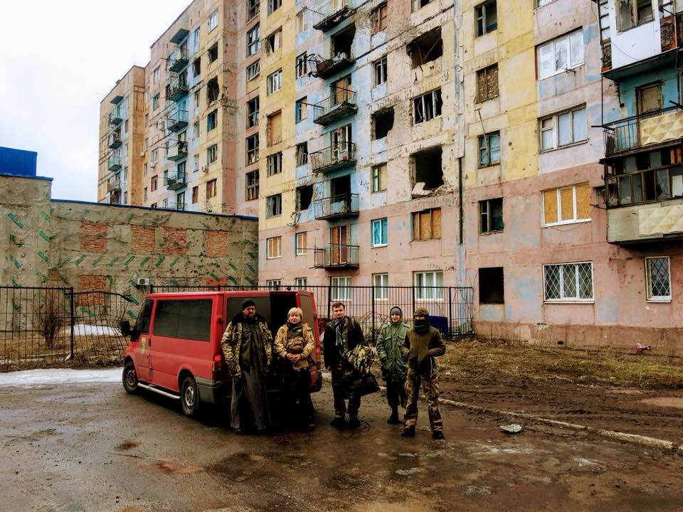 В Авдіївці Яна Зінкевич знімає квартиру у розбомбленому будинку для людей, які приїжджають, аби могли заночувати, перепочити. Ну ось ми приїхали розібрали кімнати – де хто спить, кинули речі та й поїхали до кафе «Київ». Там було дитяче свято, але хазяйка кафе знайшла нам столик. Чудово посиділи години півтори в теплі. Роздяглися, помили руки теплою водою, скористалися нормальним туалетом, отримали доступ до Інтернету, поїли борщу. Бігають діти, висять кольорові кульки. Поруч війна, а життя продовжується. А чебуреки взяли з собою.