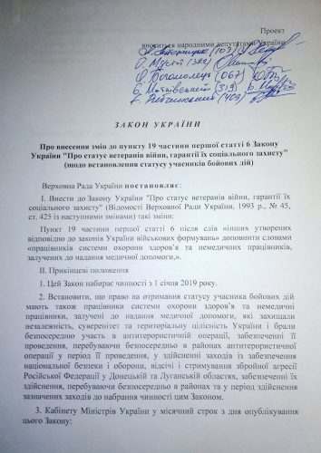Законопроект, розроблений Першим добровольчим мобільним шпиталем ім. Миколи Пирогова у співпраці з народними депутатами, ініціювали п'ять законодавців: Андрій Антонищак, Олег Мусій, Ольга Богомолець, Богдан Матківський та Євген Рибчинський. Сканований документ на Facebook опублікував Олег Мусій, назвавши його надзвичайно важливим законопроектом. "Медичні працівники, які у військових умовах, з величезним ризиком для життя та здоров’я рятують наших воїнів, надавали та надають допомогу військовослужбовцям, правоохоронцям, добровольцям та цивільному населенню в районах бойових дій з Московією, повинні мати однаковий статус, пільги та соціальні гарантії, незалежно від наявності у них військових звань та належності до офіційного війська чи інших військових формувань, утворених відповідно до законів України", – написав народний депутат.