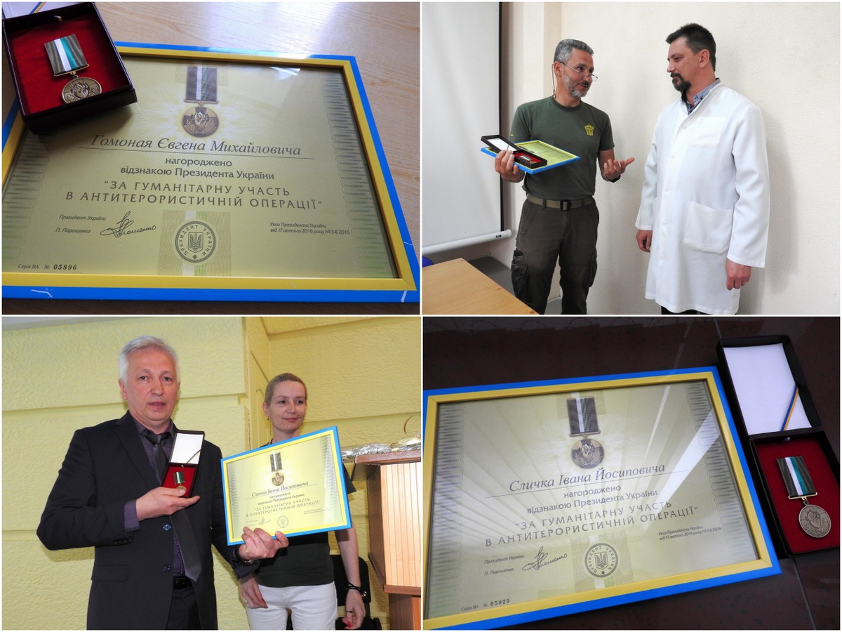 Лікарі-добровольці ПДМШ Євген Гомонай та Іван Сличко отримали присвоєні раніше відзнаки Президента України “За гуманітарну участь в АТО”. Ці дві президентські відзнаки – останні з тих, якими нагородив пироговців Президент Петро Порошенко. Як пожартував голова наглядової ради ПДМШ Геннадій Друзенко, "ми намагалися встигнути, поки на свідоцтвах про нагороди стоїть підпис чинного президента".